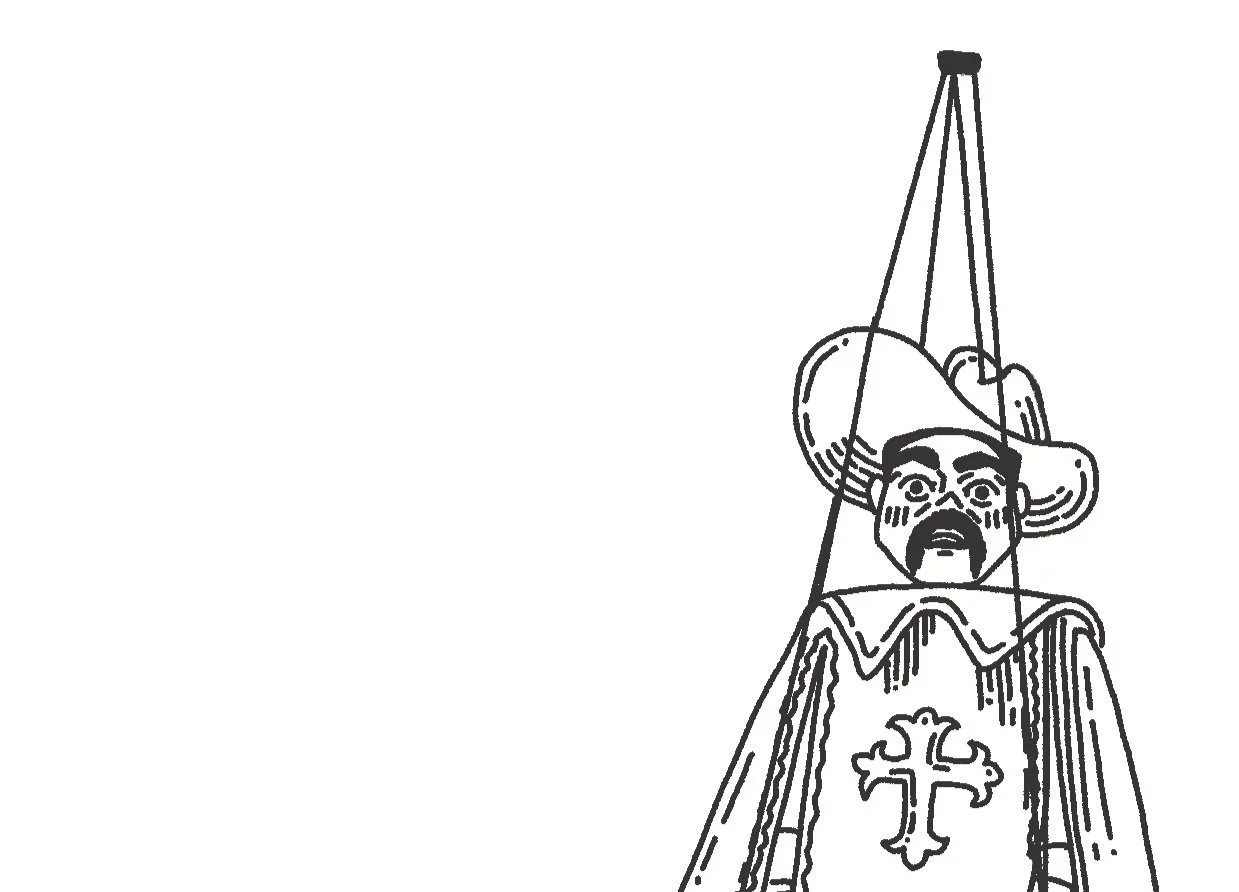 I sit down at the table at the foot of the bleachers at one of the rickety chipped tables, and directly across from me is an old stage, caged behind a cobwebbed chicken wire fence. I feel a cat brush against my leg under the table. Behind the wire cage are a pair of duelling marionettes. Their cheeks are brushed with rouge and they are wearing the tan boots, blue tunic and strident poses of musketeers. One of them, the furthest one, is eyeballing me. He is ventriloquist strange rather than punch grotesque.
